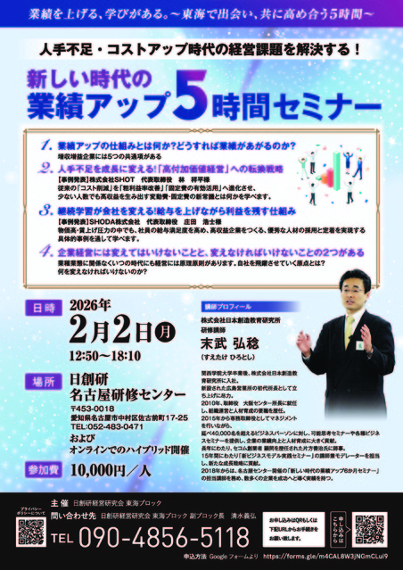 本セミナーを通じて、会員一人ひとりが自身の経営を見直し、実践的な行動変容へとつなげること、さらには単会の枠を超えたつながりや相互刺激を生み出すことを目的とします。学ぶ風土を再醸成し、東海ブロック全体の研鑽力・成果創出力を引き上げていきます。